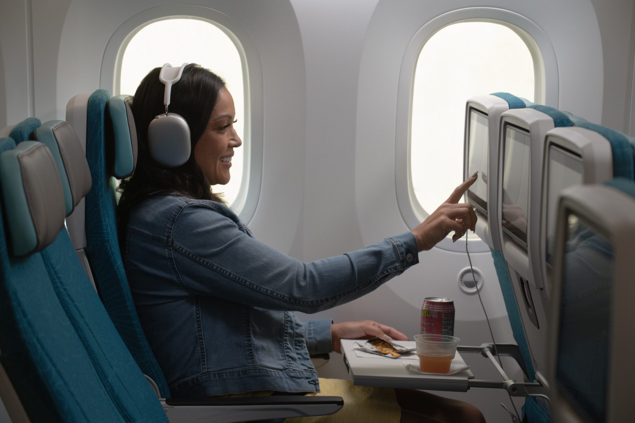 In Hawaiianʻs 787 Dreamliner Main Cabin, consisting of 266 Collins Aerospace Aspire seats with ergonomically contoured back and arm rests, guests will enjoy a lightweight, modern design that maximizes seat space, offers more shoulder and hip room, and features a 12-inch seatback monitor with USB-A and USB-C charging ports. Seventy-nine Extra Comfort seats offer more legroom and access to AC outlets.